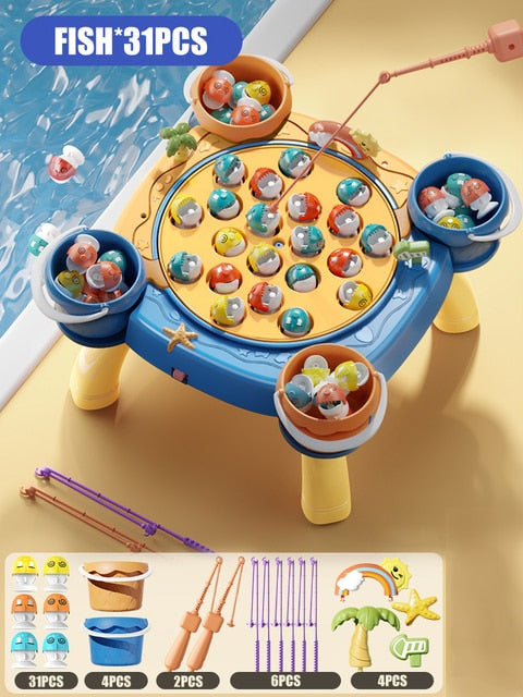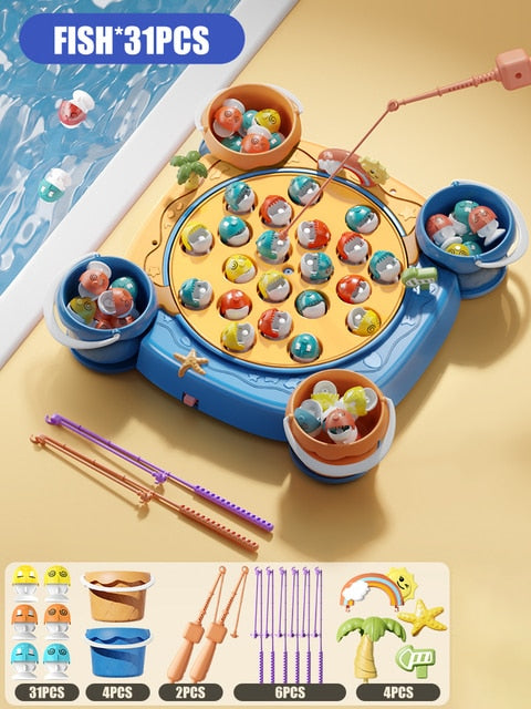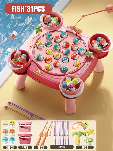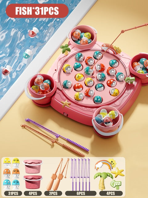 Todos os peixinhos possuem peças magnéticas em suas bocas para serem fisgados na hora que as varas encostam neles. deixando a pescaria ainda mais diverida para os seus filhos.
