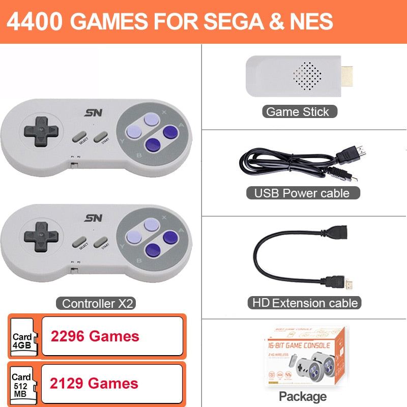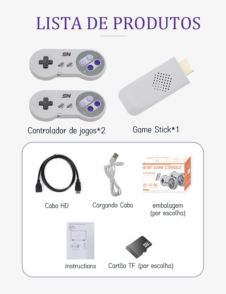 A Loja Jogos Antigos e Nerdices te apresenta agora a fusão entre os melhores jogos desenvolvidos pela Nintendo com a melhor tecnologia de jogabilidade. Apresentamos especialmente pra você o nosso super Nintendo Retrô 4k com dois controles sem fio e mais de 4800 Jogos de Megadrive e Super Nintendo já instalados.